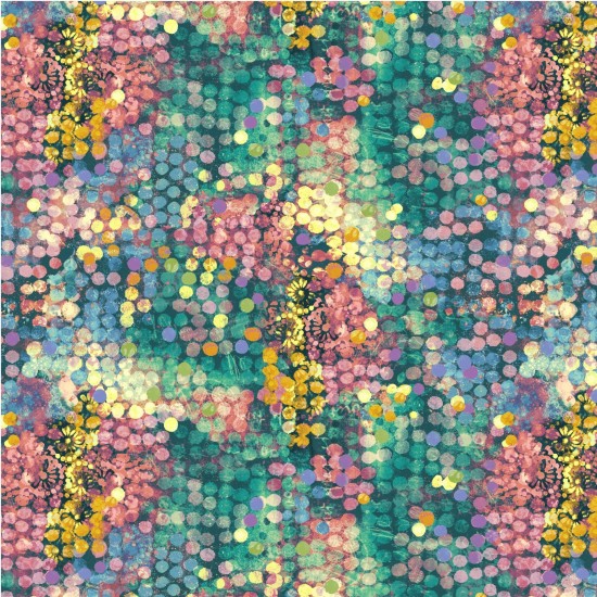Dots and spots in pink and teal toning with patches of yellow dots.